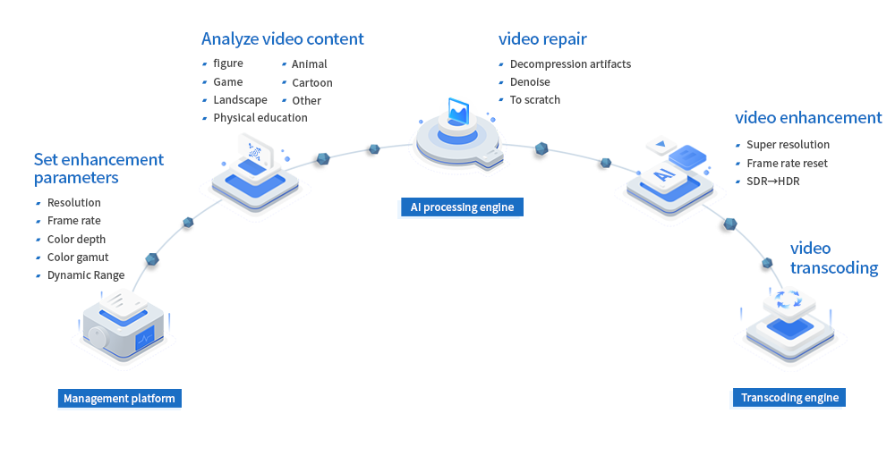 Integrate super resolution technology, deblurring technology, high frame rate technology and other restoration algorithms, build a pool for combined algorithms, and automatically select processing paths based on video features in order to optimize the processing process and improve efficiency.