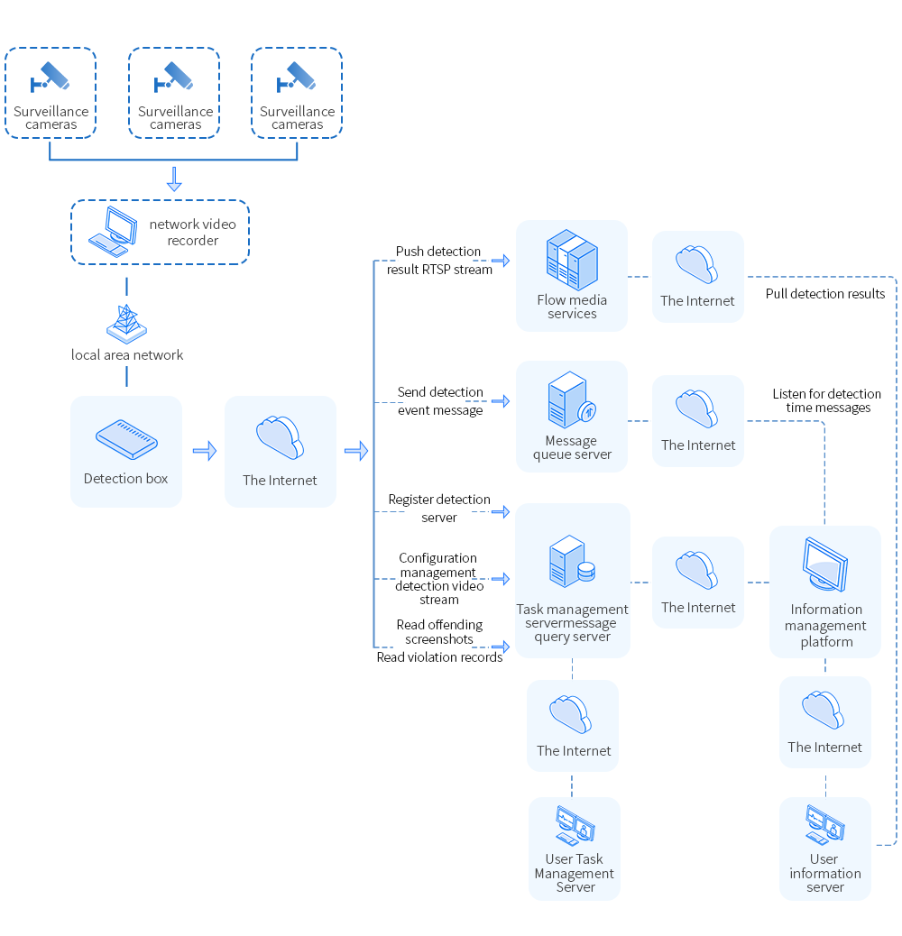 Based on artificial intelligence visual detection and analysis technology, it can intelligently monitor the sanitation status and operation specifications of the back kitchen, effectively guarantee the status of kitchen safety guards, reduce labor supervision costs, and improve the supervision efficiency of law enforcement departments.
