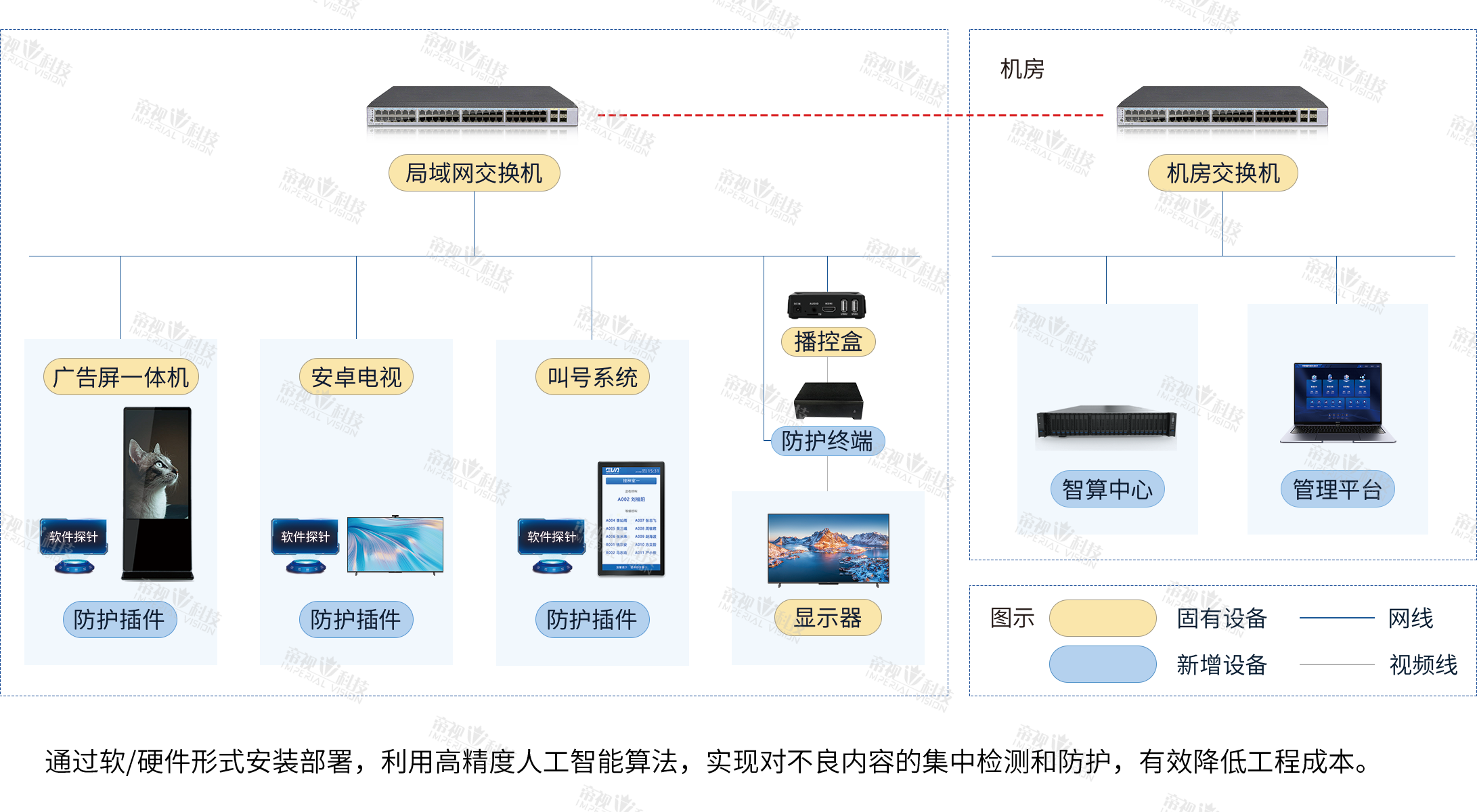 分布式显示内容安全解决方案,由显示内容智算中心与软探针内容防护插件/硬探针内容防护终端共同构成。为多台显示设备提供多节点、集中化、智能化的Al内容安全解决方案,实现对不良内容的集中检测和防护,同时提供智能监测状态上报与管理功能。