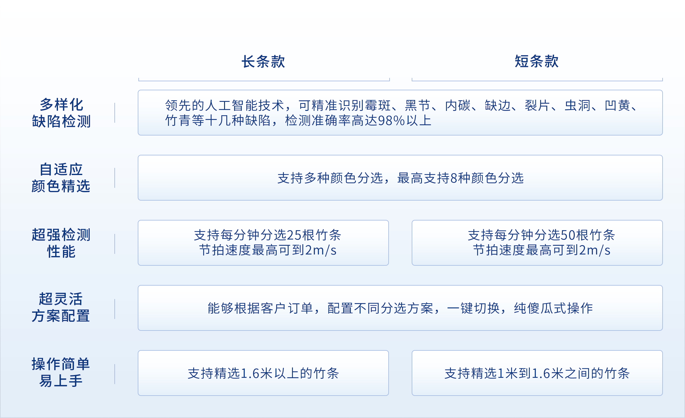 基于业内领先的人工智能图像识别技术,不良竹条分选正确率不低于99%,良品竹条过检率不超过3%;涵盖多样化缺陷,包括裂片、缺边、虫洞、竹青、平黄、凹黄、霉斑、内炭、黑节、刀疤等十多类,客户可自定义分选基准,灵活把控产品质量。